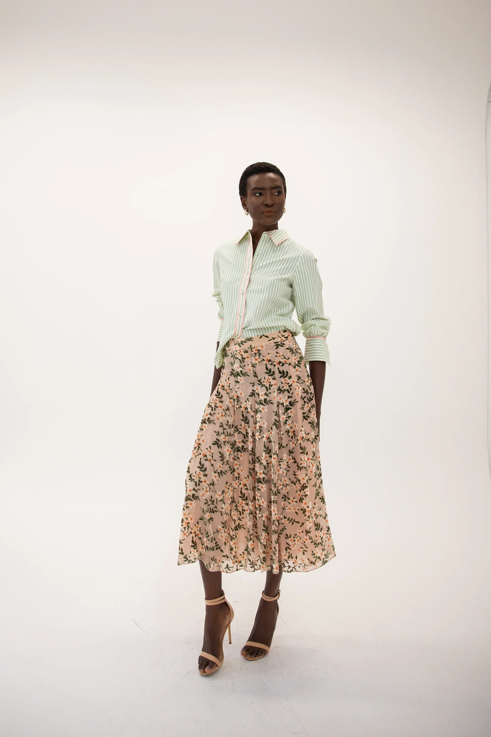 A mint striped shirt is lightly tucked in to define the waist, creating a tailored look. This keeps print mixing stylish rather than overwhelming. The floaty blush floral midi skirt adds movement and romance, with warm peach and green tones that match the stripes for a harmonious outfit. Nude heeled sandals make the legs look longer and highlight the prints. This outfit is great for garden parties, brunches, or any daytime event where you want to look polished and effortless.