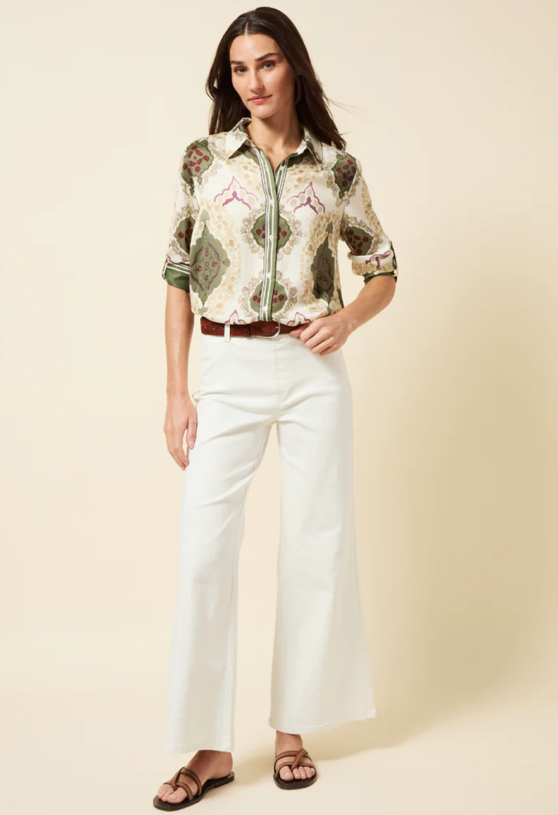 Step into effortless polish with this airy sage‑print shirt paired with high‑waisted ivory wide‑leg trousers. The relaxed silhouette lengthens the leg and skims gracefully over the body, while the warm tan belt and simple sandals keep the look grounded and wearable from brunch to city strolls.